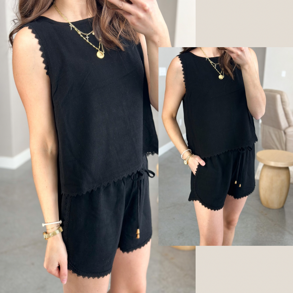 Lace details, pockets, elastic waist, great coverage! ALL the things you want in this beachy vibes set!