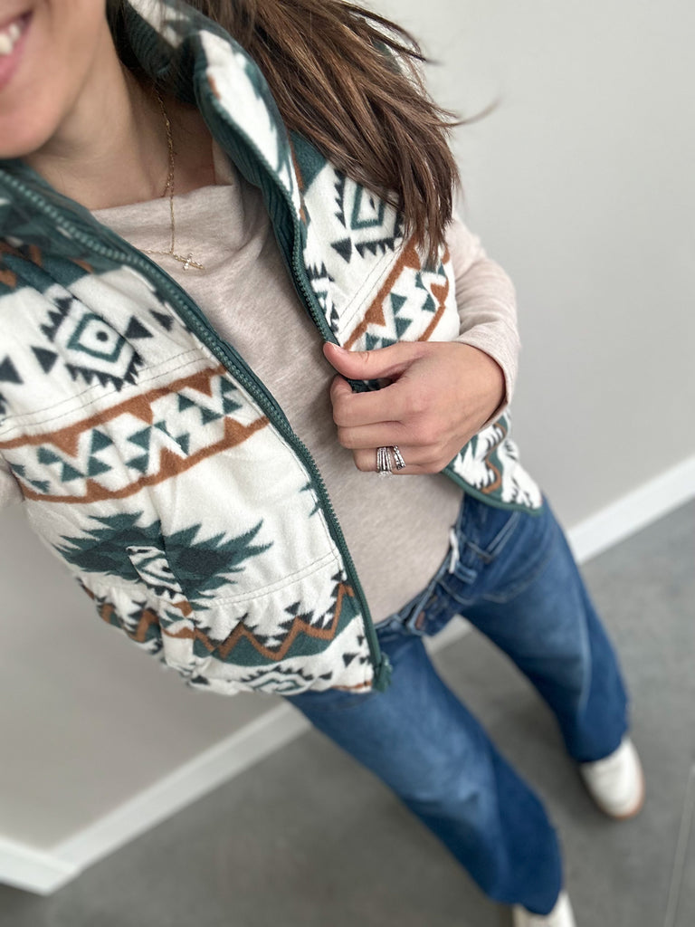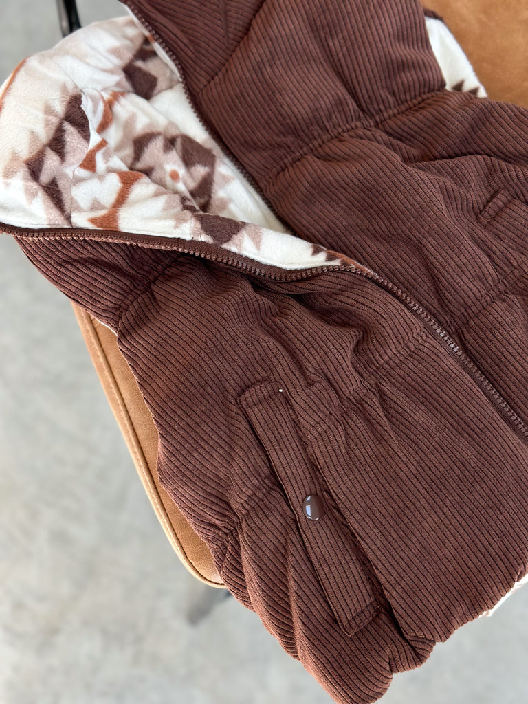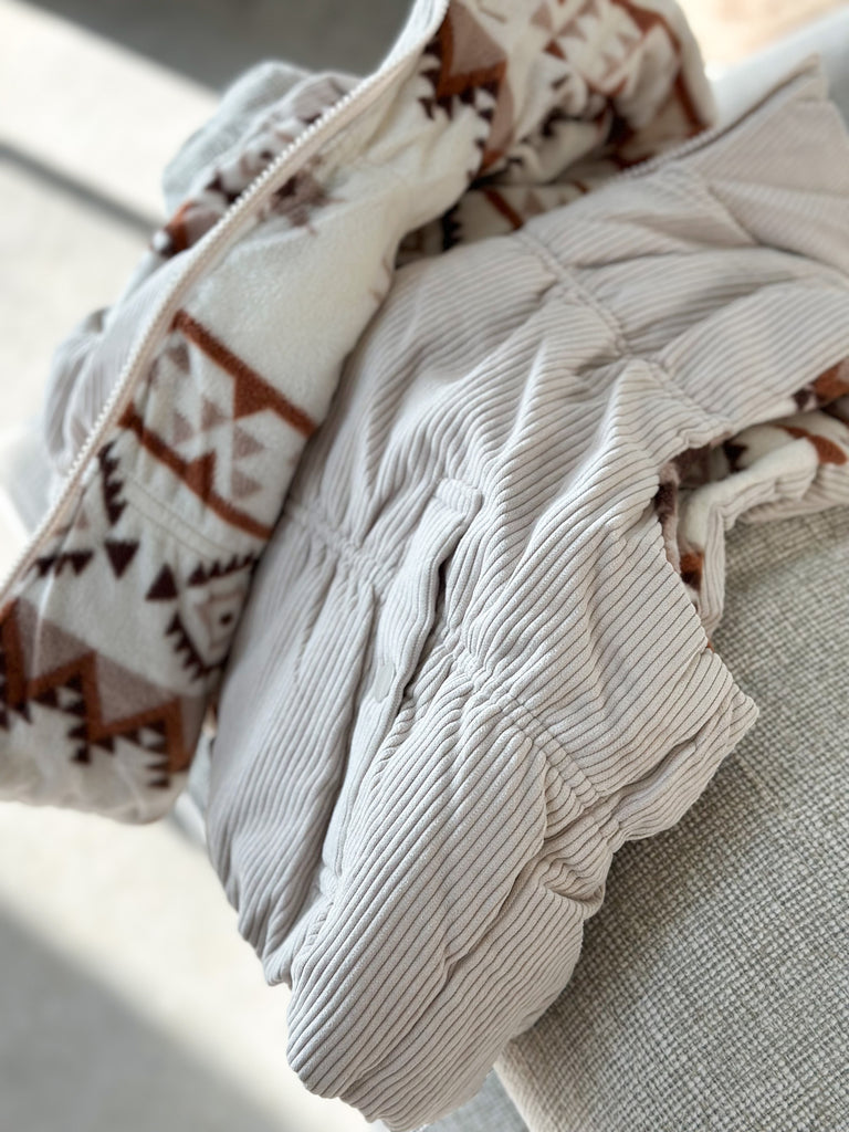 It’s a thicker corduroy outside and soft fleeced Aztec inside!